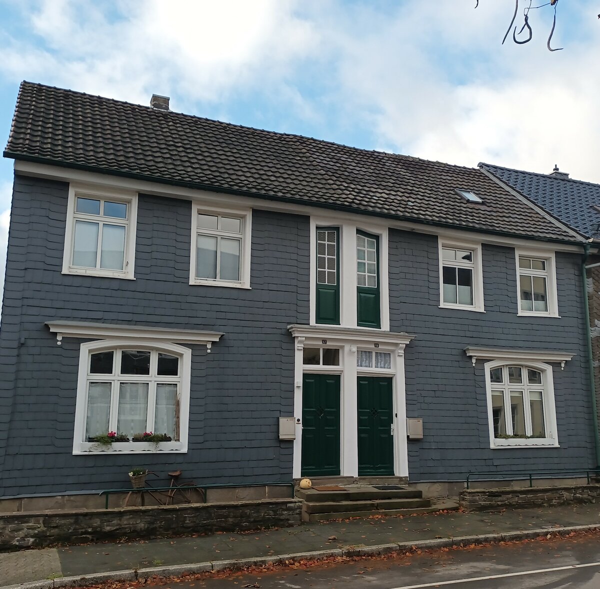 Das Doppelhaus wurde um 1860 erbaut. Hier hatte der „Postmüller“ seine Poststelle. Es wechselten die Nutzer und Eigentümer. Treppenstufen führen zu den zwei gleichen, kunstvoll gearbeiteten Eingangstüren mit Oberlicht und Karniesgesims. Eine ausgewogenen Fensteranordnung und Schieferverkleidung in der Fassade lassen auf einen kundigen Bauherren schließen und bestätigen das Bild der Eichenhofstraße als „Straße der Reichen“.