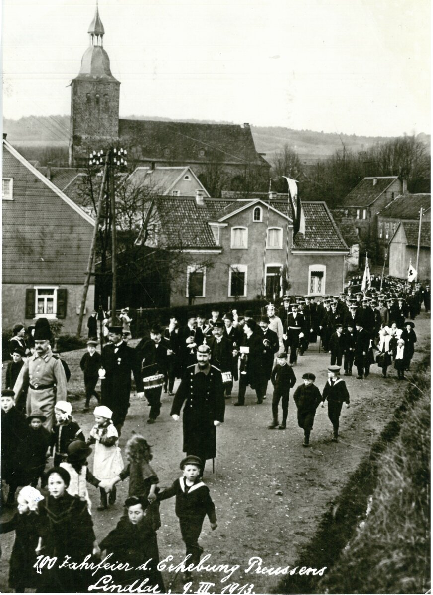 09.03.1913, Fotograf unbekannt; Umzug zur 100-Jahrfeier der Erhebung Preussens. Personen siweit bekannt: links, heller Mantel Gendarm Johann Isarel, rechts mit langem dunklem Mantel Polizeimeister Wilhelm Kaiser, Trommler Franz Klein, Posaunisten Hubert Frielingsdorf, Math. Josef Schäfer, Hermann Miebach