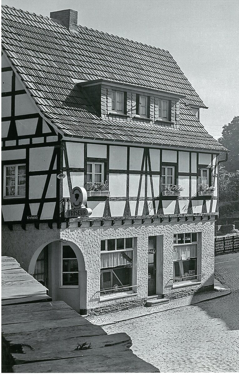 Ursprünglich als Haus des Küsters bekannt, danach als Lebensmittelgeschäft mit einer Poststation. Reinold Sax übernahm 1911 das sogenannte „Eckhaus“ und richtete sein Friseur- und Barbiergeschäft ein. 1937 wurde das Haus abgerissen und als“ bergisches Fachwerkhaus“ wieder aufgebaut. Sohn Karl übernahm den Salon als Herren- und Damenfriseur, Sohn Dieter gab 1970 das Geschäft auf.