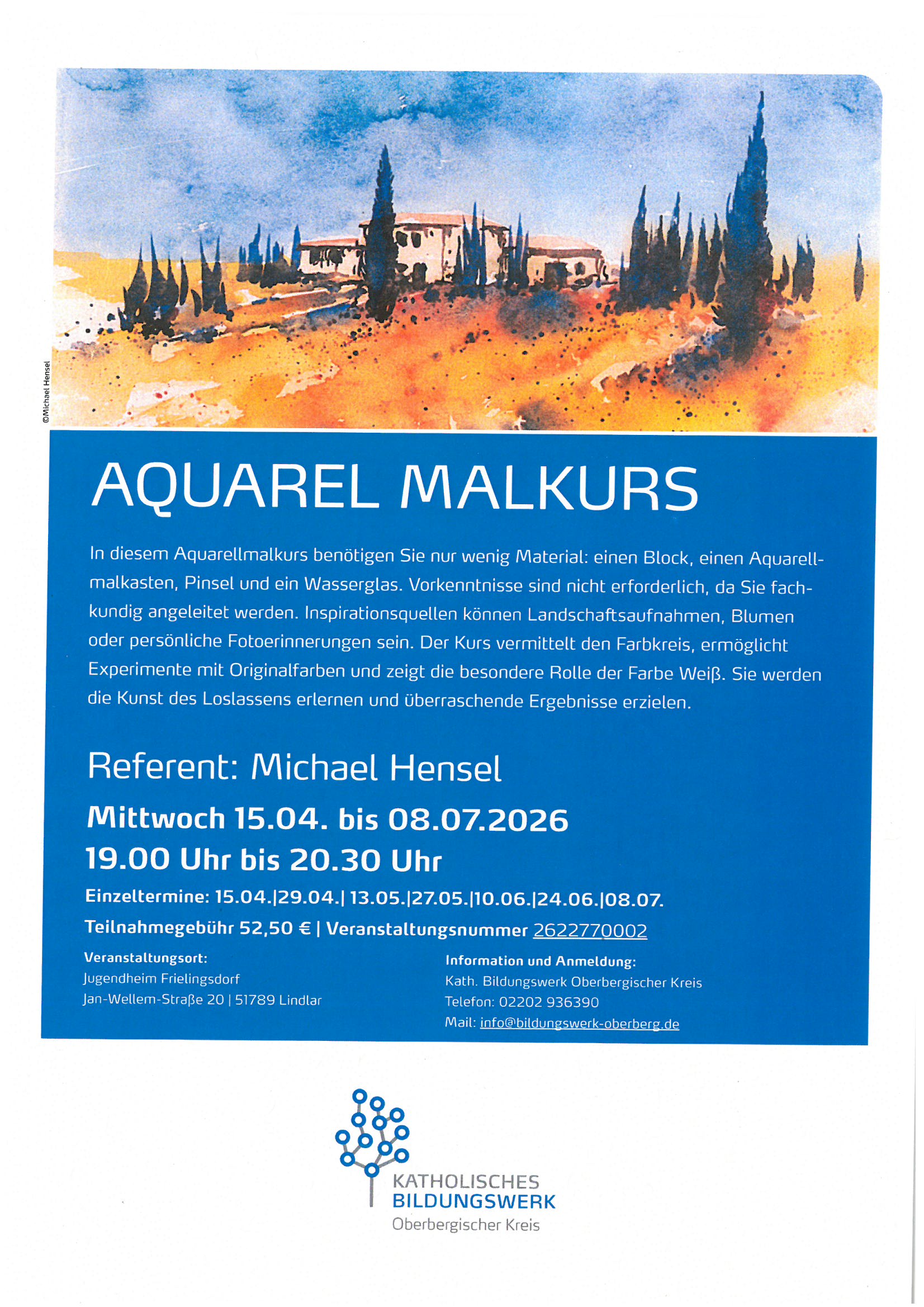 In diesem Aquarellkurs benötigen Sie nur wenig Material: einen Block, einen Aquarellmalkasten, Pinsel und ein Wasserglas. Vorkenntnisse sind nicht erforderlich, da Sie fachkundig angeleitet werden. Inspirationsquellen können Landschaftsaufnahmen, Blumen oder persönliche Fotoerinnerungen sein. Der Kurs vermittelt den Farbkreis, ermöglicht Experimente mit Originalfarben und zeigt die besondere Rolle der Farbe Weiß. Sie werden die Kunst des Loslassens erlernen und überraschende Ergebnisse erzielen.