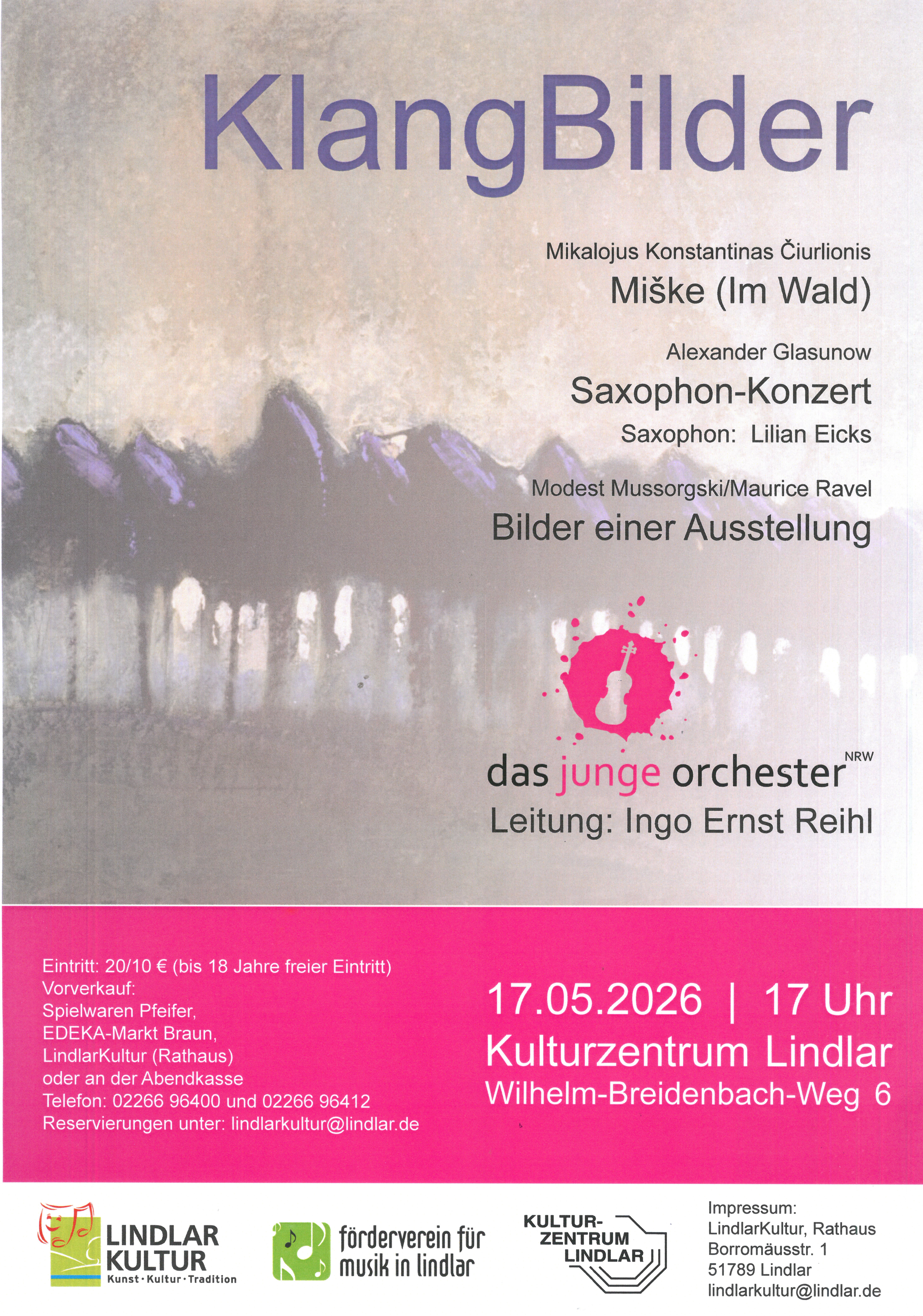 „KlangBilder“ lässt Musik zur Malerei werden — und Malerei zur Musik. Alle drei Werke bezeugen die Suche nach Ausdrucksformen, die das Auge hören und das Ohr sehen lassen. Von Čiurlionis’ mystischem Naturpanorama über Glasunows farbiges, streicherspezifisches Klangspektrum bis zu Mussorgskis und Ravels musikalischer Galerie spannt sich ein Bogen, der die Grenzen der Künste überwindet. Das Konzert lädt das Publikum ein, die Welt der Töne als Galerie des Hörens zu erleben — ein Abend, an dem Bilder klingen und Klänge leuchten.